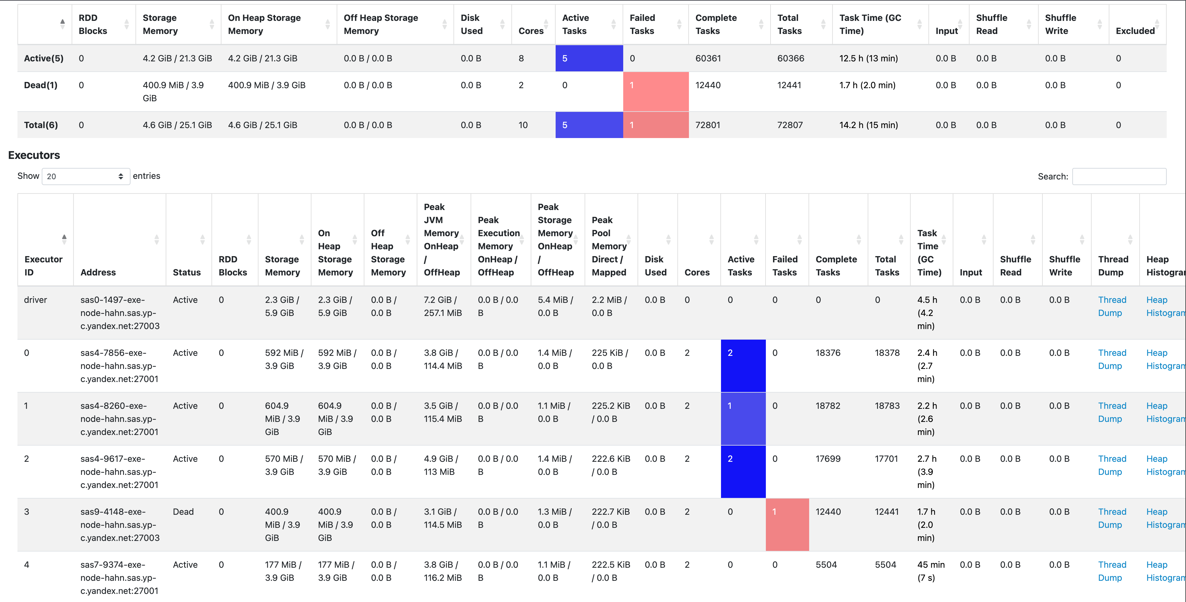 On the Executors page, you can see the number of active, failed, and completed tasks and figure out how optimally the executor cores are loaded. Additionally, you can check memory usage statistics. Occasionally, when dealing with memory leaks, you can go to Thread Dump or Heap Histogram to identify the cause for them.