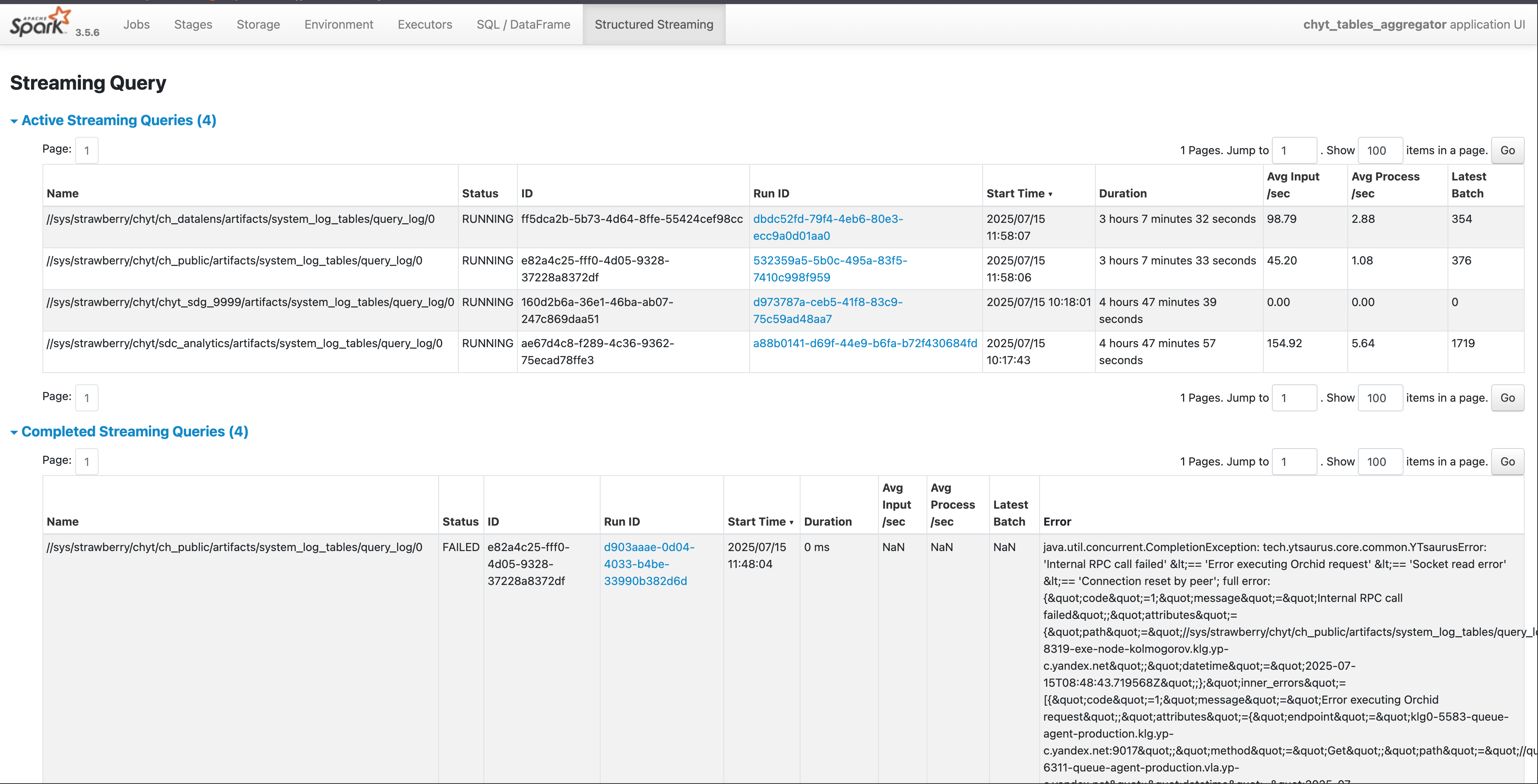 For streaming processes, the Structured Streaming page appears in the webUI by default. Here you can view statistics for active and completed streams. For example, it may be useful to check the error that caused the Streaming Query to terminate.