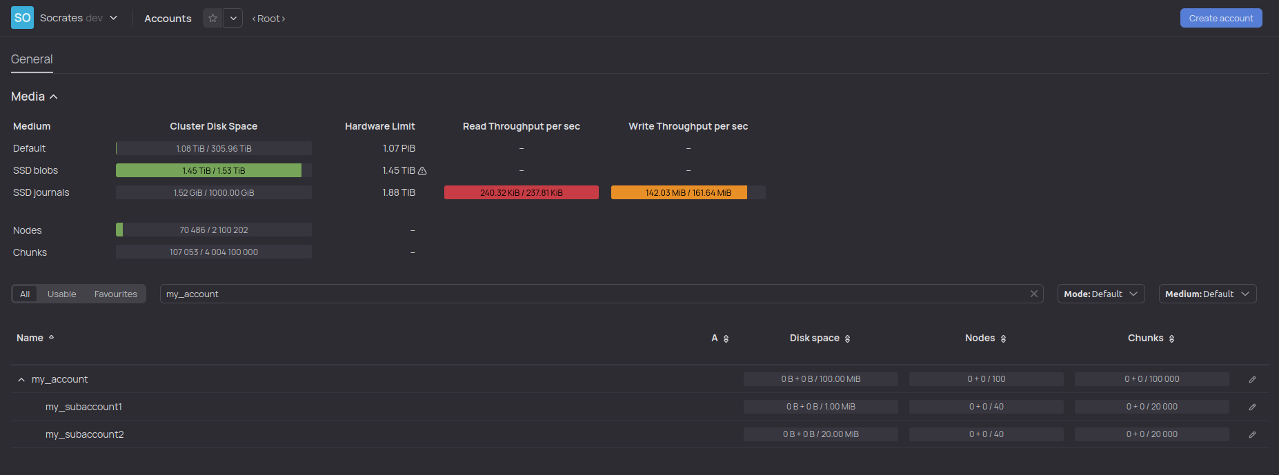 sysaccount. During initialization, it is assigned to all other nodes. By default, no explicit permissions to use it are given to anyone. The account is used for the internal needs of the YTsaurus system.
