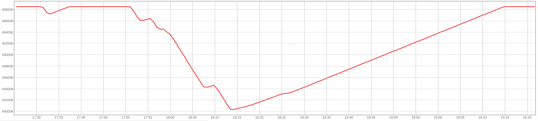 На рисунке ниже приведён график объёма накопленного ресурса для того же пула. Видно, как объём виртуального ресурса уменьшается при запущенных операциях в пуле, а после ресурс вновь накапливается до заданного предела.
