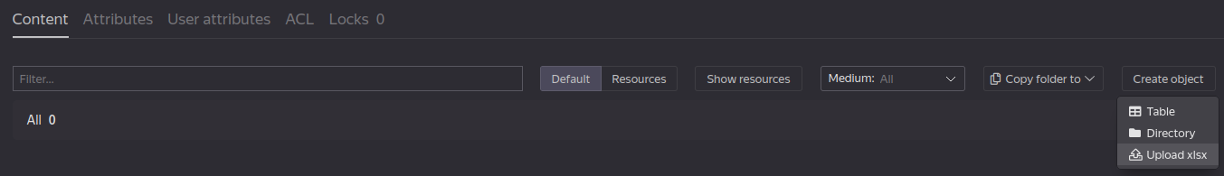 Чтобы загрузить данные с одновременным созданием YTsaurus таблицы, следует нажать кнопку Create object на странице директории. Из выпадающего меню выбрать Upload xlsx.