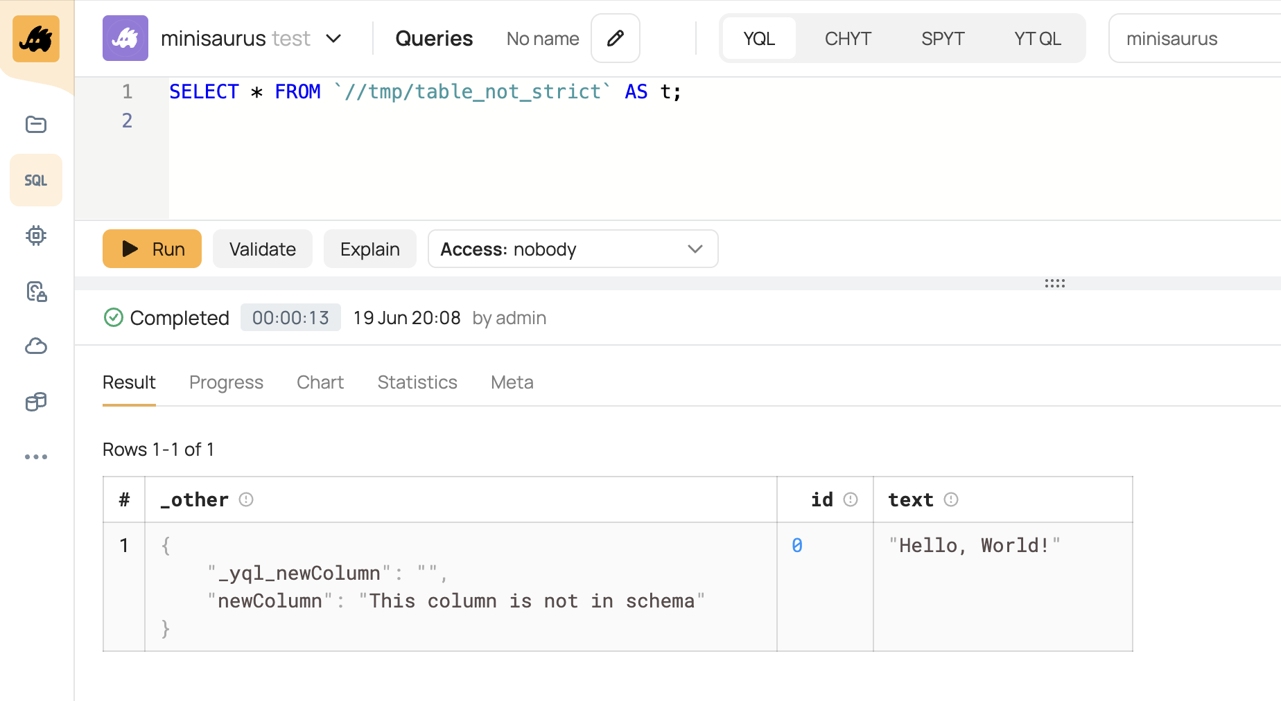 $ echo '{ "id": 0, "text": "Hello, World!", "newColumn": "This column is not in schema" } ' | yt write-table //tmp/table_not_strict --format json